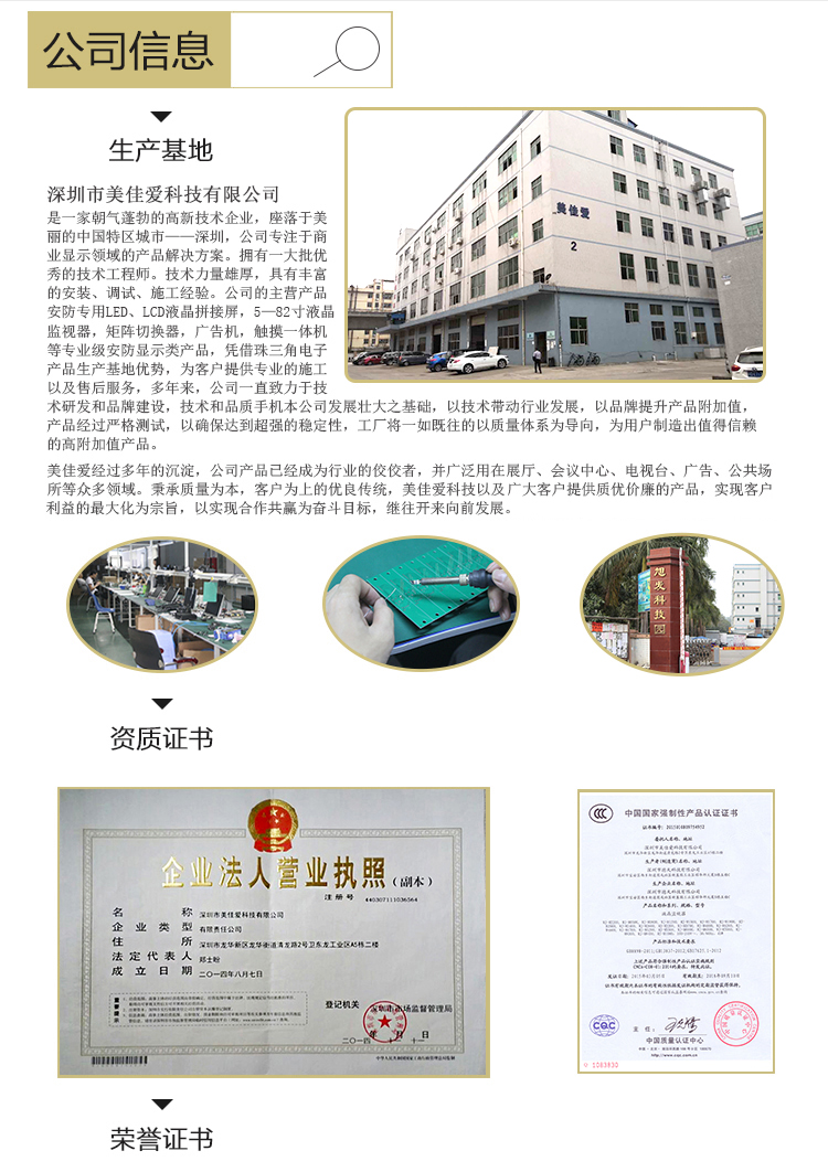 【深圳市美佳愛-液晶廣告機,觸摸一體機生產廠家電話400-997-9971】49寸紅外觸摸一體機(電腦/壁掛)產品通過ISO9001_3C認證,主營多點紅外/電容式觸摸屏一體機,觸控查詢一體機,其他尺寸18.5寸21寸24寸27寸32寸40寸43寸46寸49寸55寸65寸75寸86寸98寸100寸多功能多媒體教學會議一體機,戶外立式/壁掛雙面廣告機,單機版/安卓網(wǎng)絡廣告機 豎屏樓宇電梯廣告機,長條型屏,工業(yè)級工控電腦觸摸顯示器,大尺寸觸摸屏查詢系統(tǒng),商顯平板電腦電視,提供報價價格,安裝施工,售后維修等