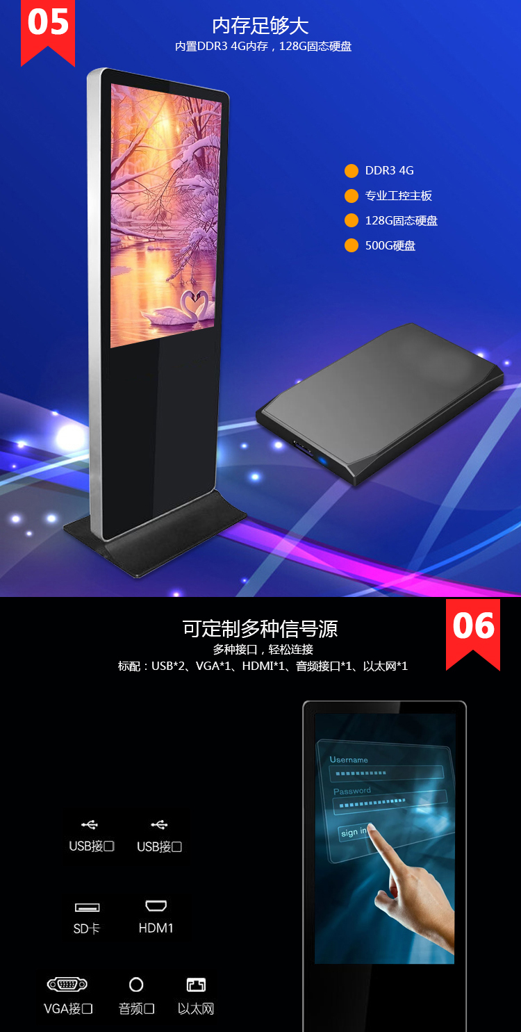 | - 觸摸方式:通過后臺發(fā)布模板鏈接網(wǎng)頁到終端設(shè)備,當(dāng)沒人觸碰顯示屏?xí)r正常播放廣告,當(dāng)有人觸摸時自動進入觸控鏈接模板