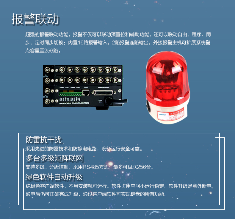 ★ 超強(qiáng)的報(bào)警聯(lián)動(dòng)功能,報(bào)警時(shí)可不僅可以聯(lián)動(dòng)預(yù)置位和輔助功能,還可以聯(lián)動(dòng)自由、程序、同步、定時(shí)同步切換;