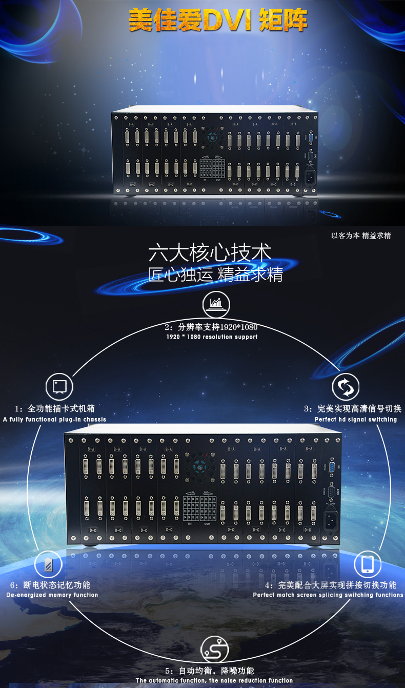 DVI高清全數(shù)字矩陣切換器, 所有端口支持藍(lán)光DVD(支持HDCP);輸入輸出自動均衡,輸入加輸出傳輸距離大于40米(不需配帶芯片的DVI線);鋁拉絲面板,帶藍(lán)光液晶顯示屏顯示操作狀態(tài);帶串口控制,可選配網(wǎng)口;所有輸入端口支持現(xiàn)場寫EDID,所有輸出端口可讀回EDID。