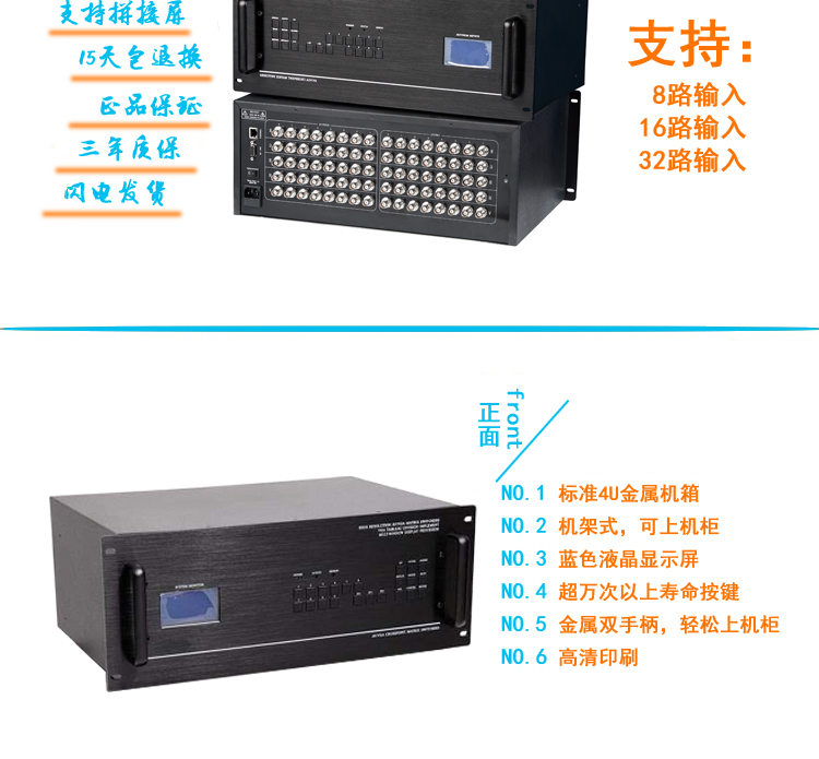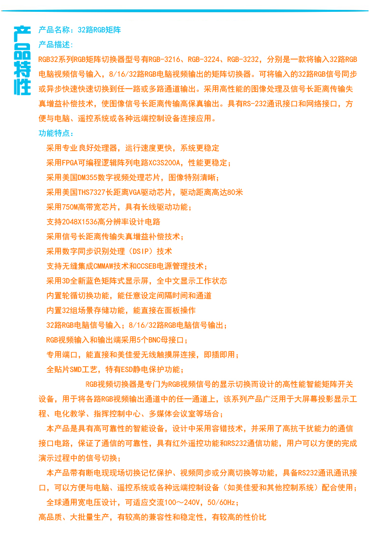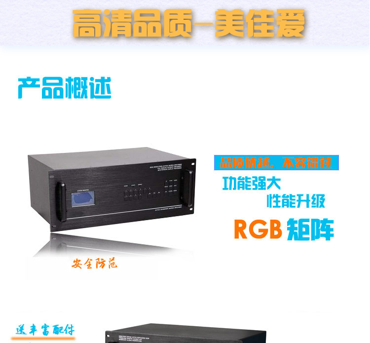 【深圳市美佳愛-矩陣切換器,視頻拼接處理器生產(chǎn)廠家電話400-997-9971】RGB矩陣切換器通過ISO9001_3C認(rèn)證,型號規(guī)格有4進(jìn),8進(jìn),12進(jìn),16進(jìn),24進(jìn),32進(jìn),48進(jìn),64進(jìn),128路輸入,4出,8出,12出,16出,24出,32出,48出,64出,128路輸出,專業(yè)提供LED視頻處理器,監(jiān)控音視頻矩陣切換器,DVI/SDI/RGB/HDMI/VGA混合矩陣,外置拼接處理器,視頻服務(wù)器,云處理器,液晶大屏幕處理器,視頻分配器,網(wǎng)絡(luò)高清數(shù)字解碼矩陣主機(jī)生產(chǎn)廠家,高品質(zhì),穩(wěn)定性強(qiáng)的產(chǎn)品和服