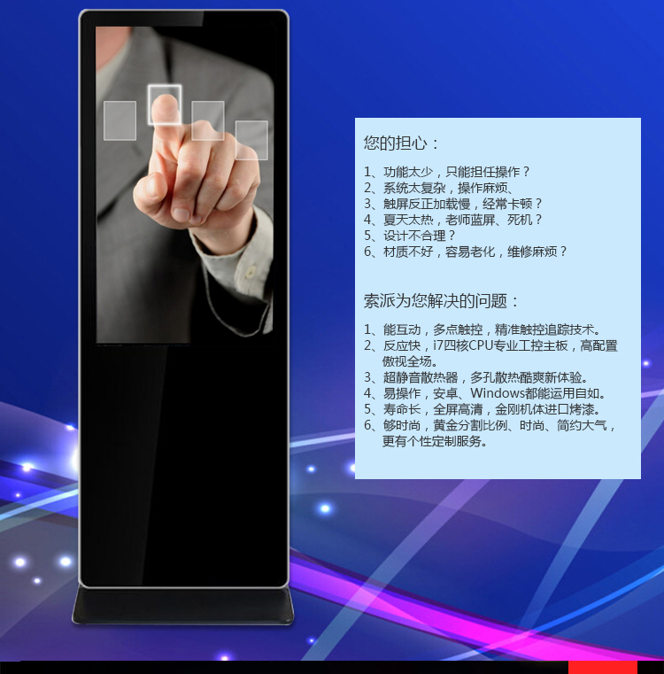 【深圳市美佳愛-液晶廣告機(jī),觸摸一體機(jī)生產(chǎn)廠家電話400-997-9971】立式觸摸一體機(jī)產(chǎn)品通過ISO9001_3C認(rèn)證,主營多點(diǎn)紅外/電容式觸摸屏一體機(jī),觸控查詢一體機(jī),其他尺寸18.5寸21寸24寸27寸32寸40寸43寸46寸49寸55寸65寸75寸86寸98寸100寸多功能多媒體教學(xué)會(huì)議一體機(jī),戶外立式/壁掛雙面廣告機(jī),單機(jī)版/安卓網(wǎng)絡(luò)廣告機(jī) 豎屏樓宇電梯廣告機(jī),長條型屏,工業(yè)級工控電腦觸摸顯示器,大尺寸觸摸屏查詢系統(tǒng),商顯平板電腦電視,提供報(bào)價(jià)價(jià)格,安裝施工,售后維修等