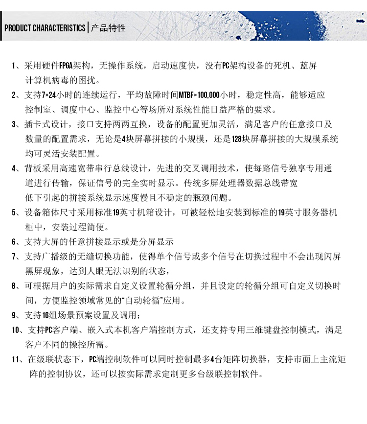 - 支持無縫切換,處理器內(nèi)部集成高清信號處理機(jī)制,保證信號切換時無延時、無藍(lán)屏、無黑屏等中間過渡狀態(tài)。