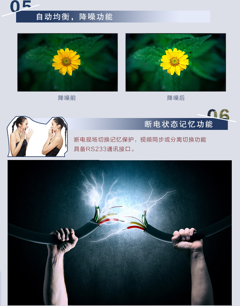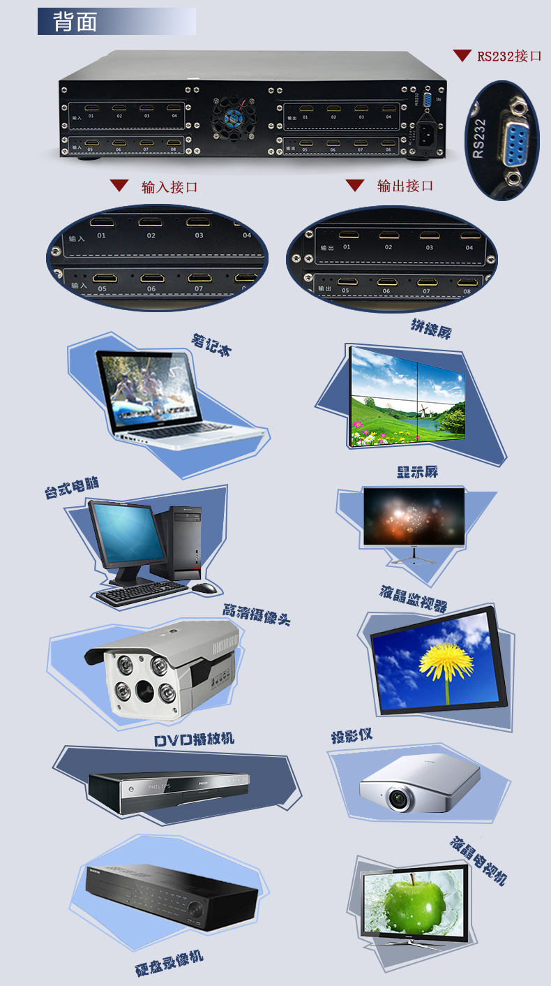 5.可拼接(選配),兼容了拼接處理器功能,支持普通電視、液晶顯示器及DLP等實現(xiàn)大屏幕拼接功能;